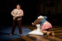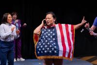 Scott, who unravels before our eyes, meanders around the theater with a child's inner tube around her neck, is comedy gold. But it's Bass, as the president's blue Slurpee-slurping farmgirl mistress Dusty, pregnant with the president's baby, who steals the show again and again.